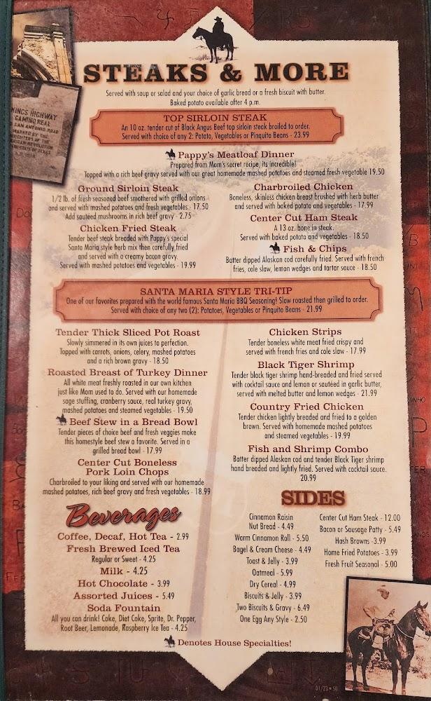 Pappy's menu offers a delightful mix of American classics and local specialties. Start with appetizers like spicy chicken wings or onion rings. Popular choices include the tri-tip sandwich and BBQ bacon burger. Breakfast enthusiasts rave about the Cowboy Breakfast and the griddle combo. Don't miss the robust tortilla soup, a crowd favorite! Fresh salads and generous sides keep the options varied. Pappy's caters to everyone, including kids, with a menu designed for families.
